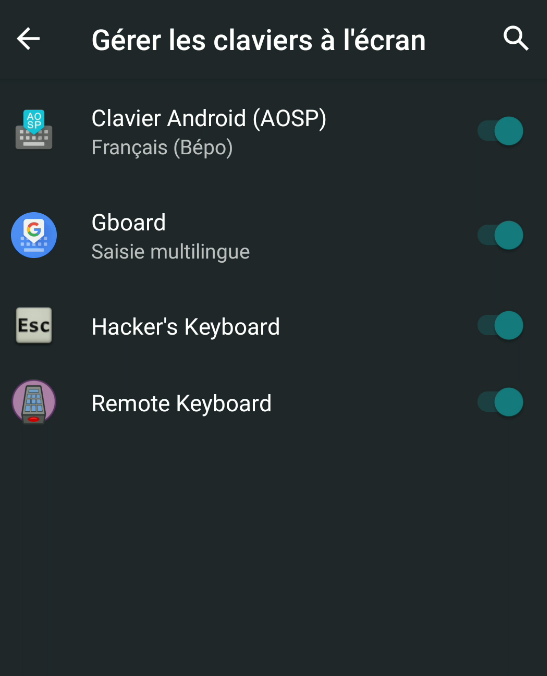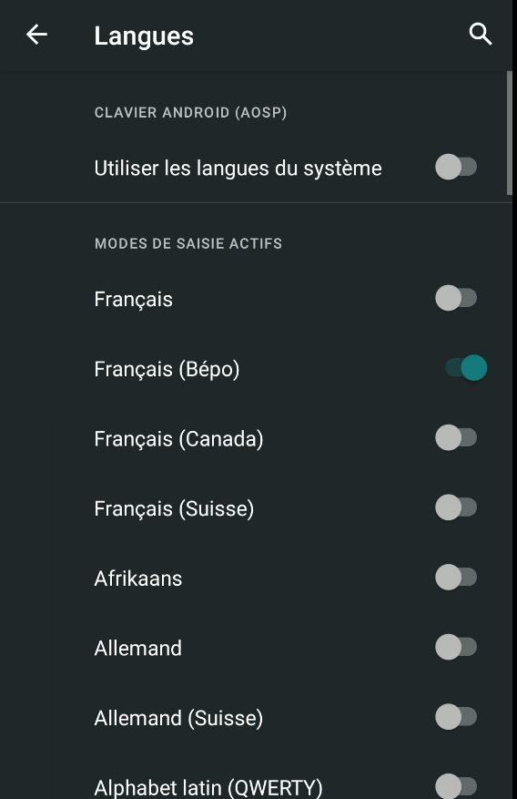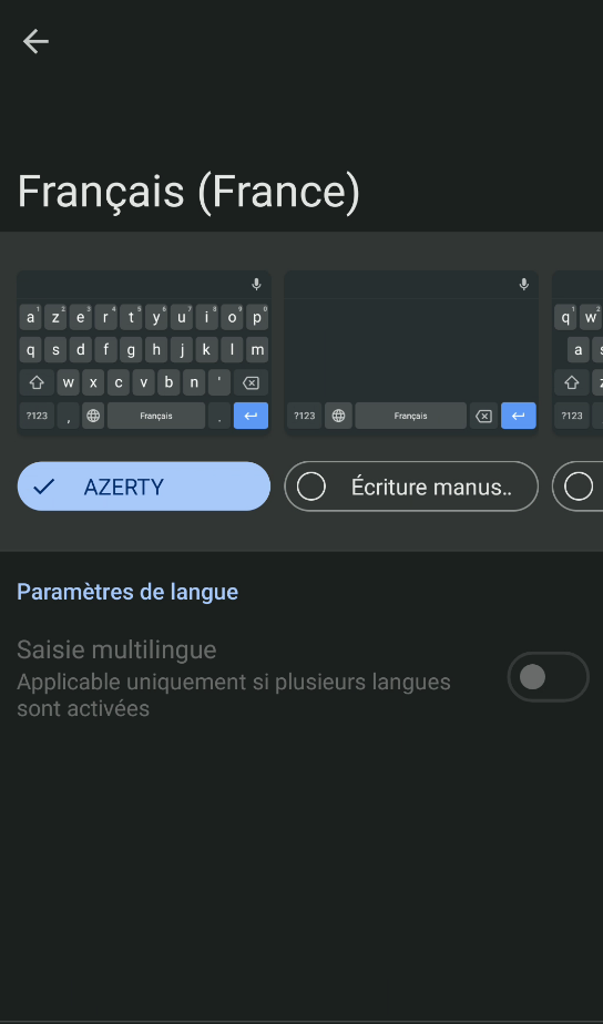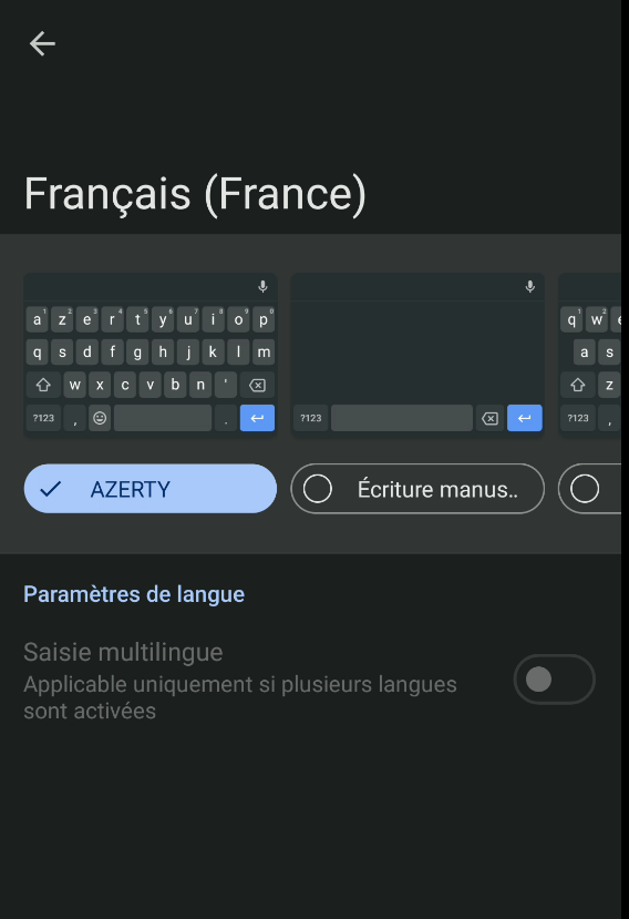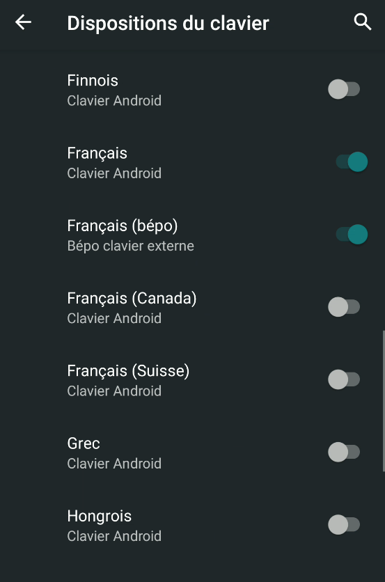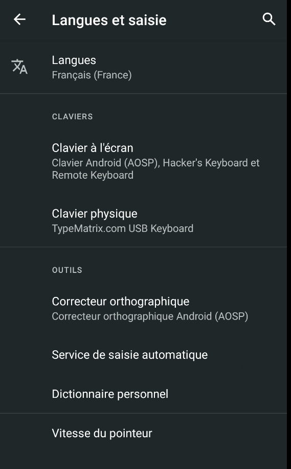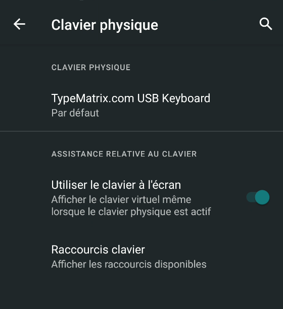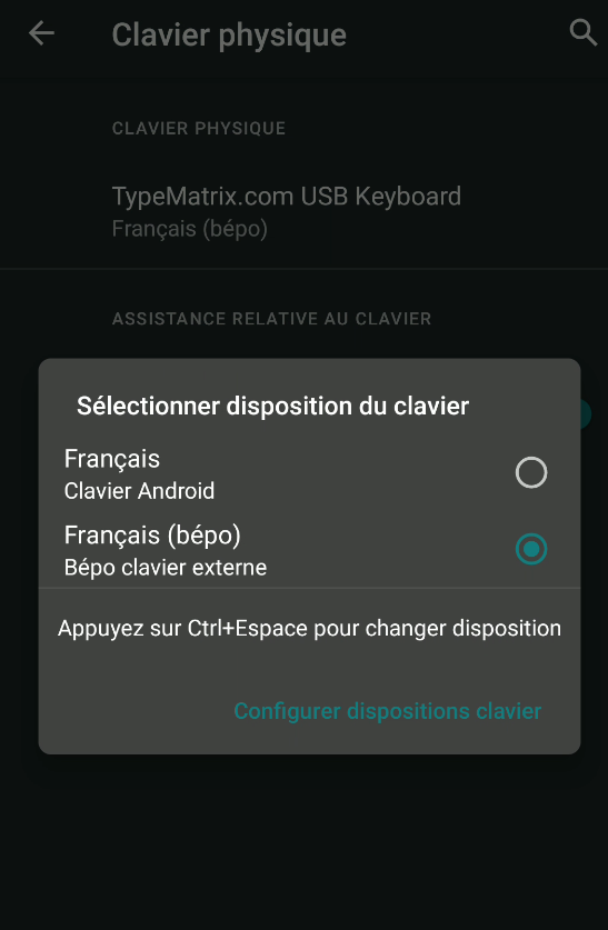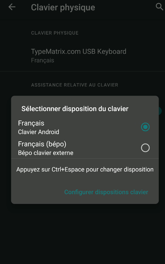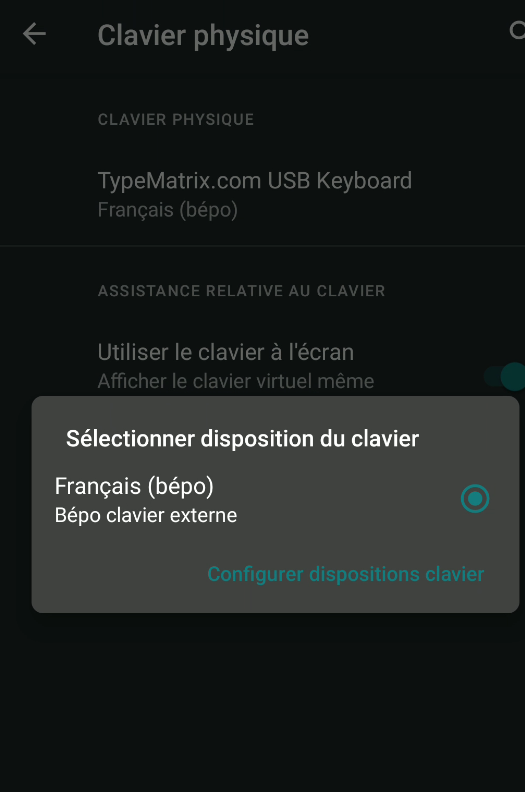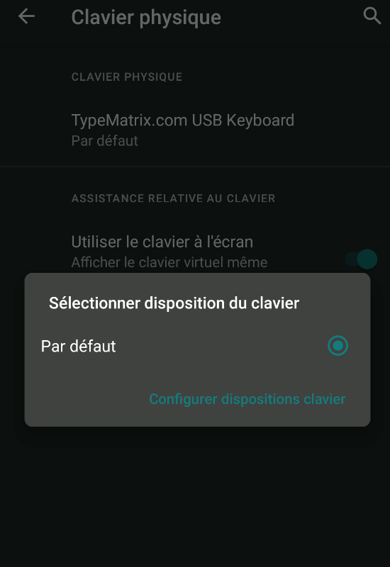 Dans Android, la disposition du clavier physique dépend du clavier virtuel sélectionné. Si vous avez plusieurs claviers virtuels, ou un clavier virtuels avec plusieurs langues, il faudra configurer la disposition pour chaque langue de chaque clavier