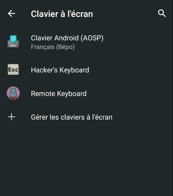 One of the tradeoff I had to make was to have the underlying key layout a QWERTY, that then generated bépo characters. This decision was due to the fact that we cannot attribute key names to all keys: ÉÀÈÊÇ, etc. don’t have key labels (found in KeycodeLabels.h or InputEventLabels.h depending on your AOSP version), so you can’t simply remap all keys in order to have a bépo key layout; you’d have holes in it. I therefore had to resort to using QWERTY as base, as it’s the one in Generic.kl.