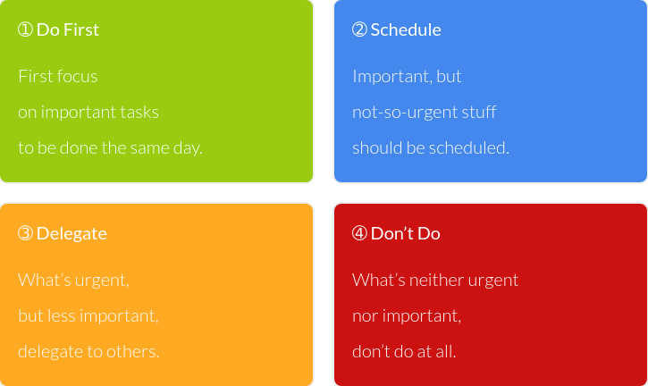 Prioritizing tasks by urgency and importance results in 4 quadrants with different work strategies
