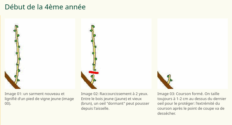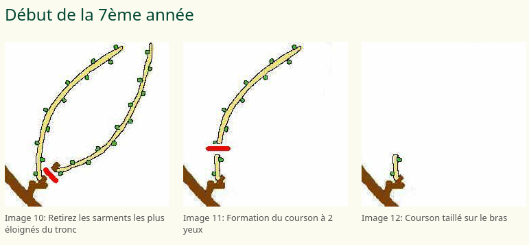 taille toujours à 1-2 cm au dessus du dernier oeil pour le protéger: l’extrémité du courson après le point de coupe va de dessécher.