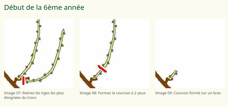 ↩︎Après plusieurs années de fructification : il faut rajeunir la vigne. Coupez entièrement le vieux bois au-dessus d’une jeune pousse venue naturellement sur la branche principale ou à la base du pied de vigne. En l’absence de jeune pousse, taillez sévèrement à la base d’un vieux sarment pour provoquer son départ.