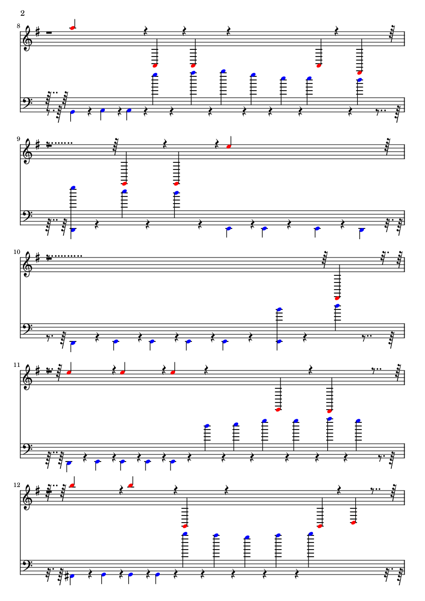 I colored the tracks to that I can see which notes I want to put in the clef F and which ones in the clef G. Unfortunately, some tracks should be split into both. That means that I should identify the notes interval to capture from one track and to put into another track.