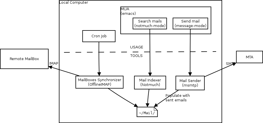 The first tool of the chain, offlineimap allows you to keep synchronised a local Maildir folder with an IMAP account.