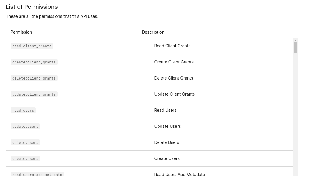 Then, in the “permission” tab of the API settings, I can add custom ones. Is seems like “permission” is the term auth0 uses for scope.