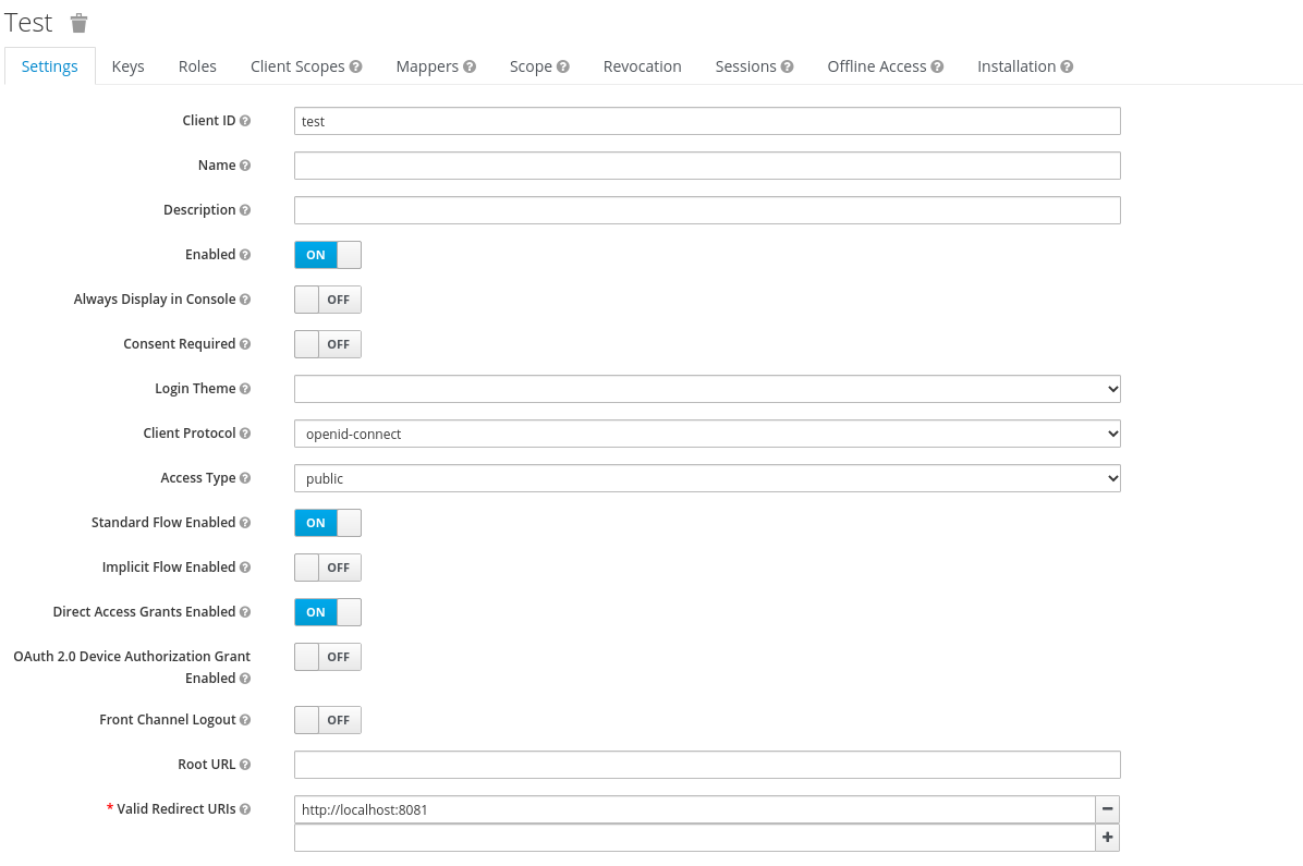 http://localhost:8080/auth/realms/test/protocol/openid-connect/auth?response_type=token&client_id=test&redirect_url=http://localhost:8081